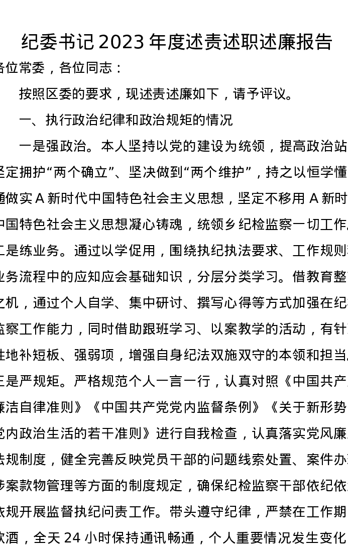 纪委书记2023年度述责述职述廉报告