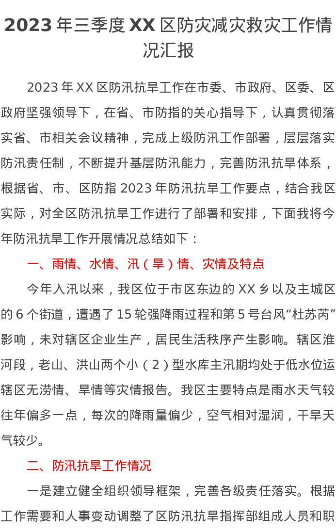 2023年三季度XX区防灾减灾救灾工作情况汇报