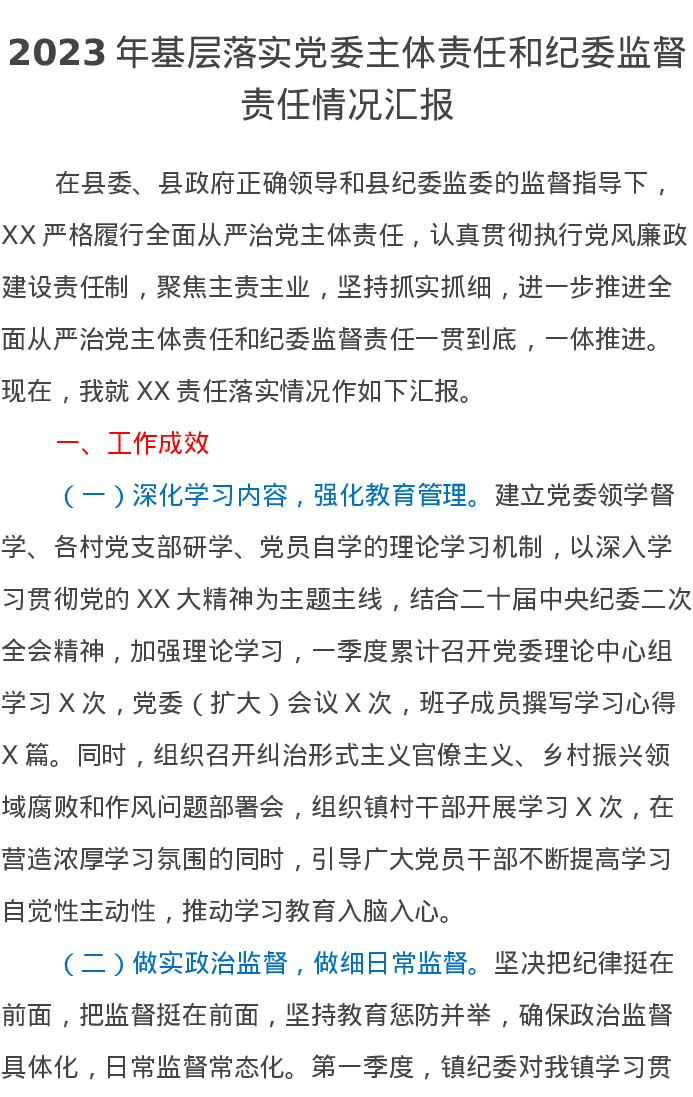 2023年基层落实党委主体责任和纪委监督责任情况汇报