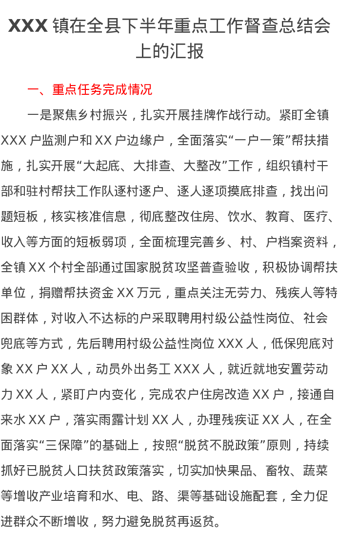 XXX镇在全县下半年重点工作督查总结会上的汇报