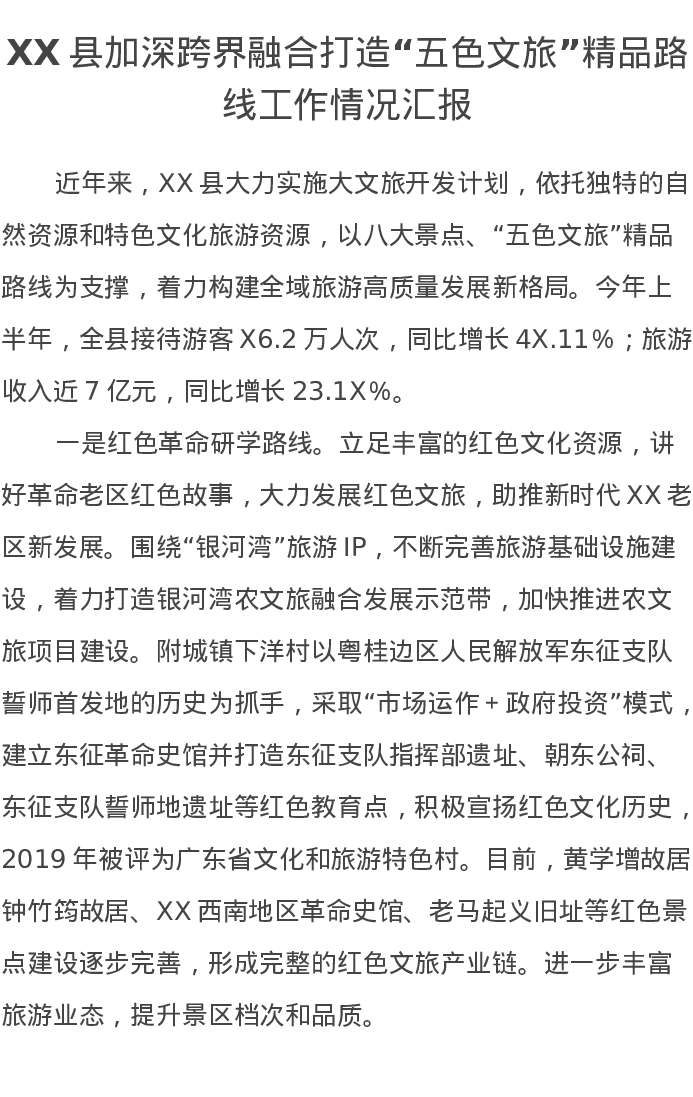 XX县加深跨界融合打造“五色文旅”精品路线工作情况汇报