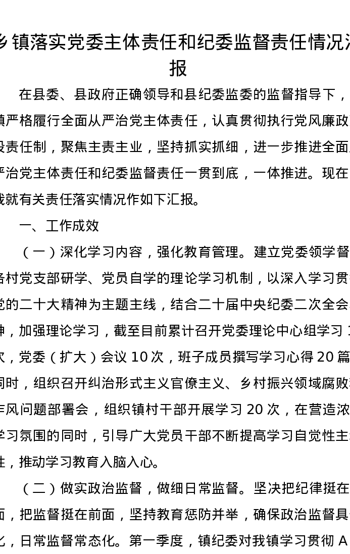 乡镇落实党委主体责任和纪委监督责任情况汇报