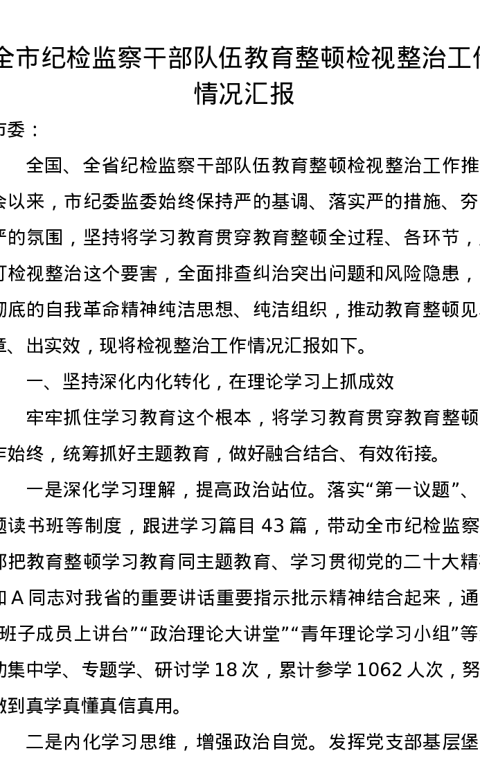 全市纪检监察干部队伍教育整顿检视整治工作情况汇报