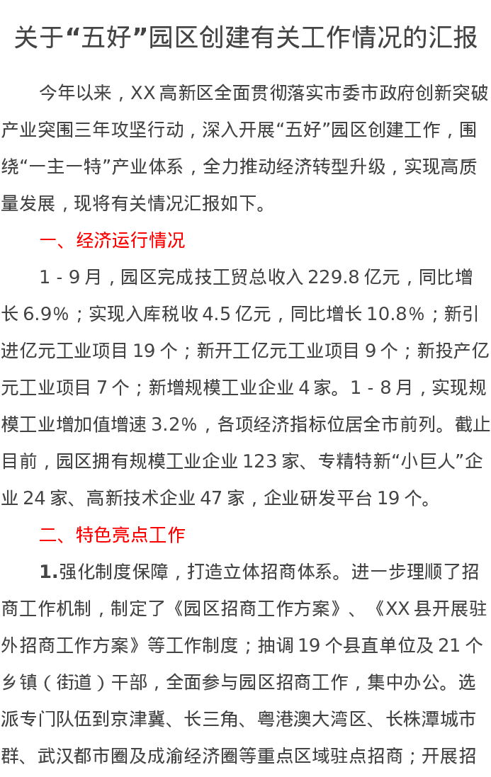 关于“五好”园区创建有关工作情况的汇报