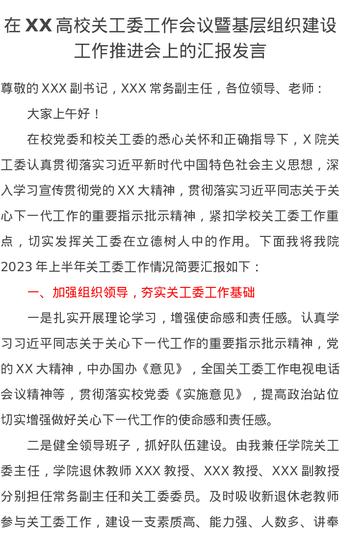 在XX高校关工委工作会议暨基层组织建设工作推进会上的汇报发言
