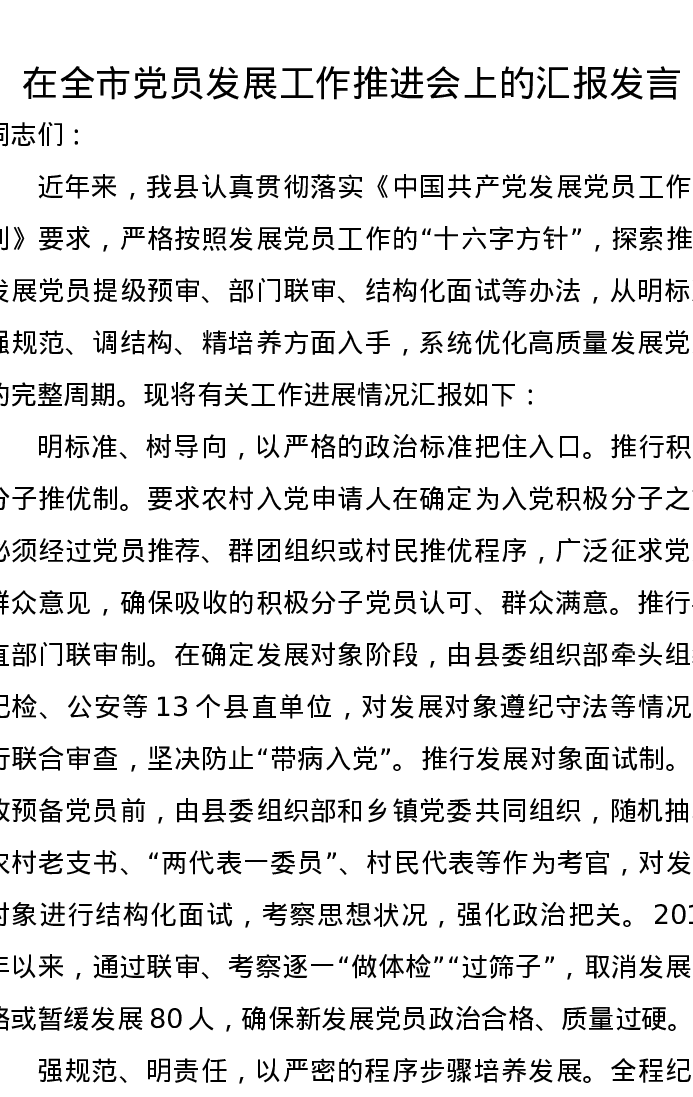 在全市党员发展工作推进会上的汇报发言