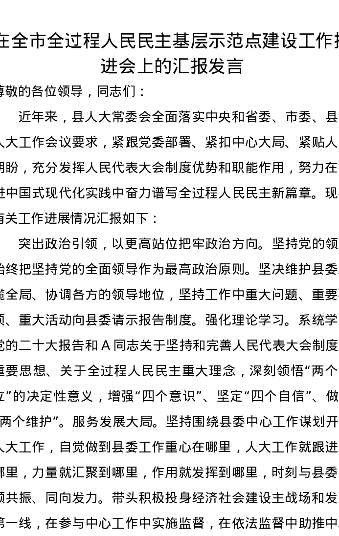 在全市全过程人民民主基层示范点建设工作推进会上的汇报发言