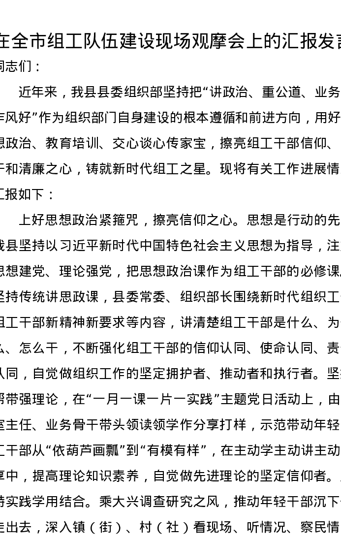 在全市组工队伍建设现场观摩会上的汇报发言