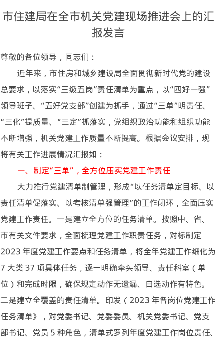 市住建局在全市机关党建现场推进会上的汇报发言