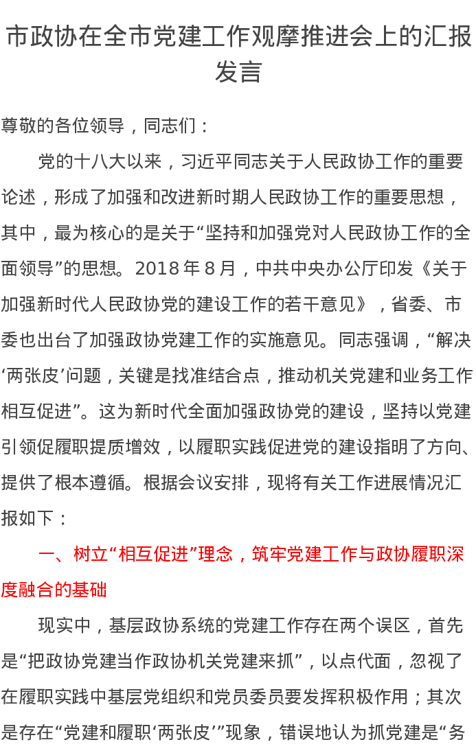 市政协在全市党建工作观摩推进会上的汇报发言