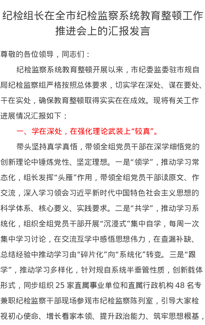 纪检组长在全市纪检监察系统教育整顿工作推进会上的汇报发言
