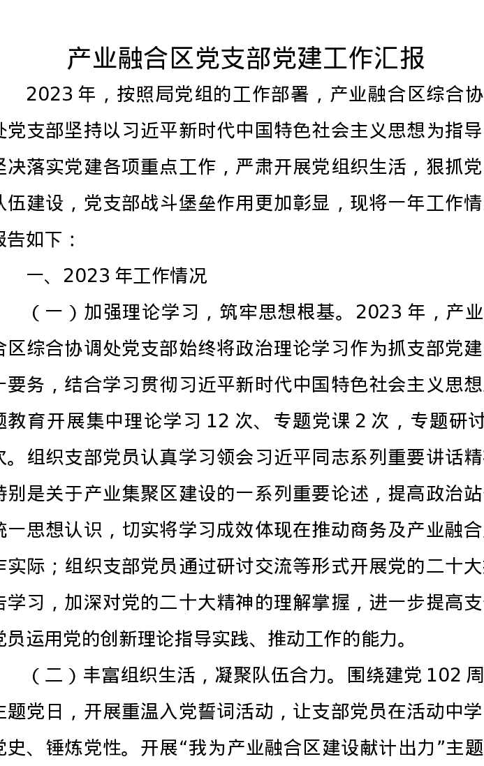 产业融合区党支部党建工作汇报