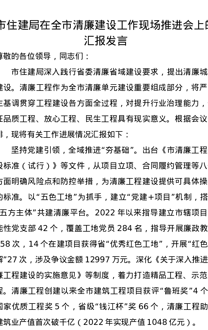 市住建局在全市清廉建设工作现场推进会上的汇报发言