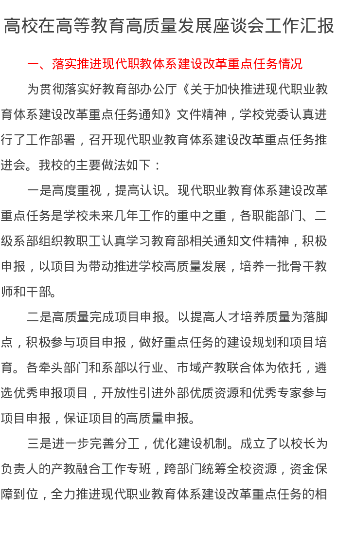 高校在高等教育高质量发展座谈会工作汇报