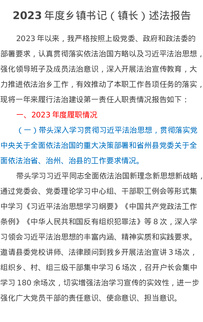 2023年度乡镇书记(镇长)述法报告