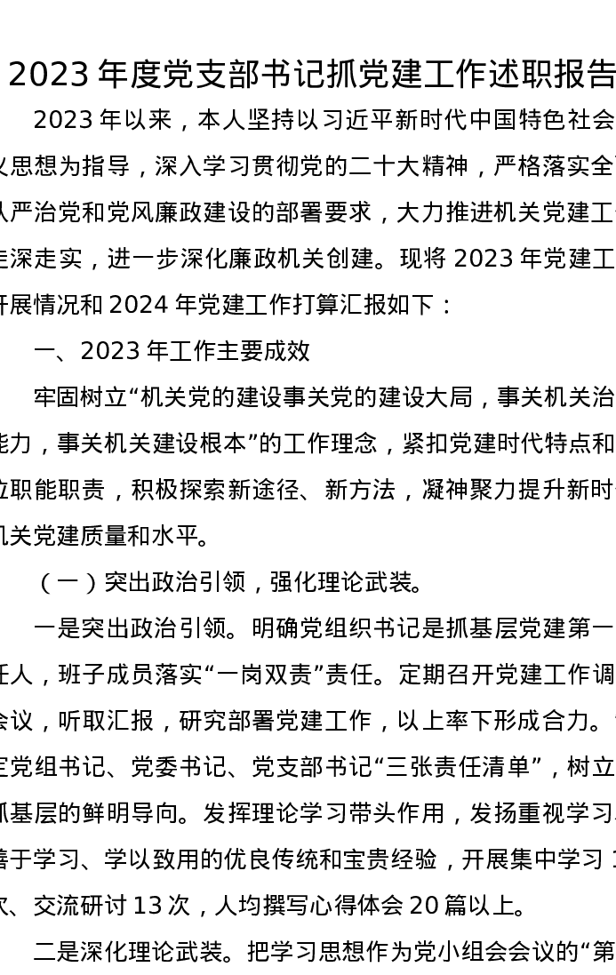 2023年度党支部书记抓党建工作述职报告