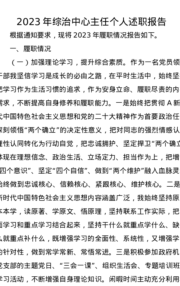 2023年综治中心主任个人述职报告