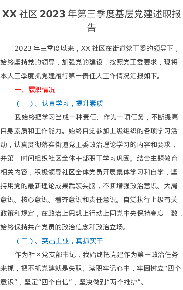 XX社区2023年第三季度基层党建述职报告