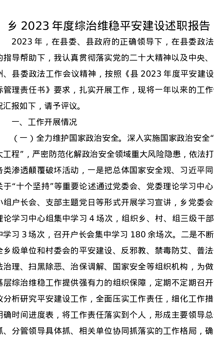 乡2023年度综治维稳平安建设述职报告
