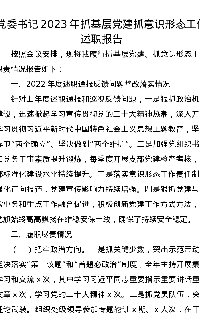 党委书记2023年抓基层党建抓意识形态工作述职报告