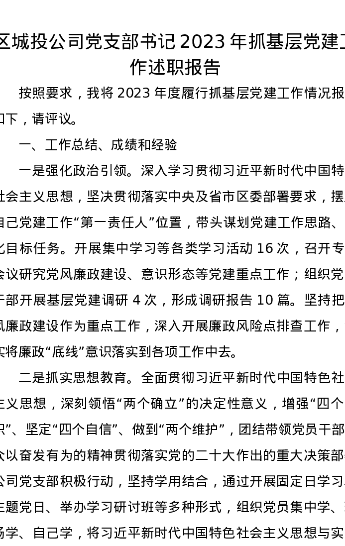 区城投公司党支部书记2023年抓基层党建工作述职报告