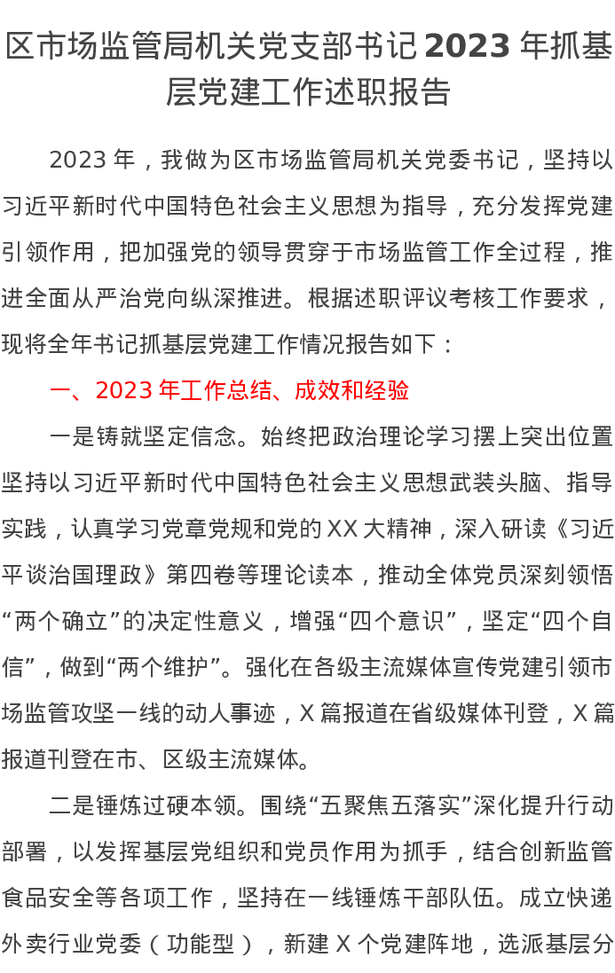区市场监管局机关党支部书记2023年抓基层党建工作述职报告