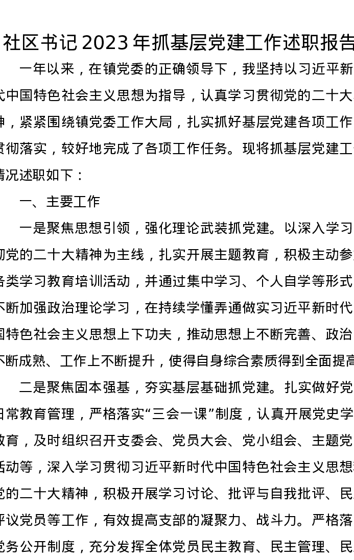 社区书记2023年抓基层党建工作述职报告