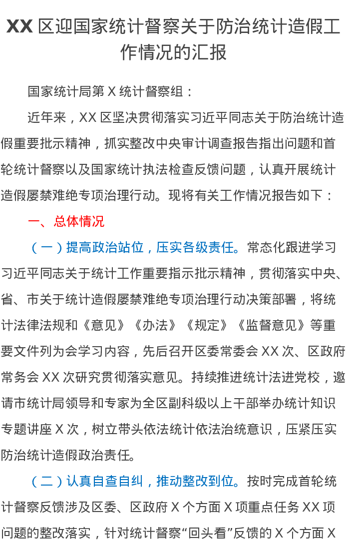 XX区迎国家统计督察关于防治统计造假工作情况的汇报