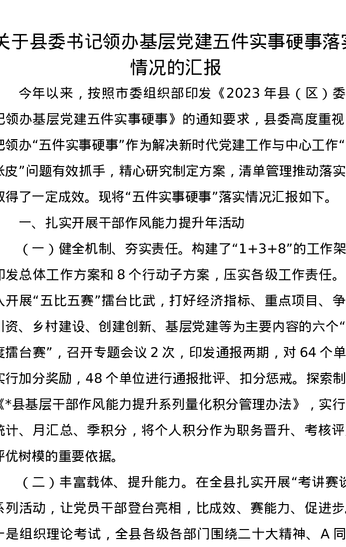 关于县委书记领办基层党建五件实事硬事落实情况的汇报