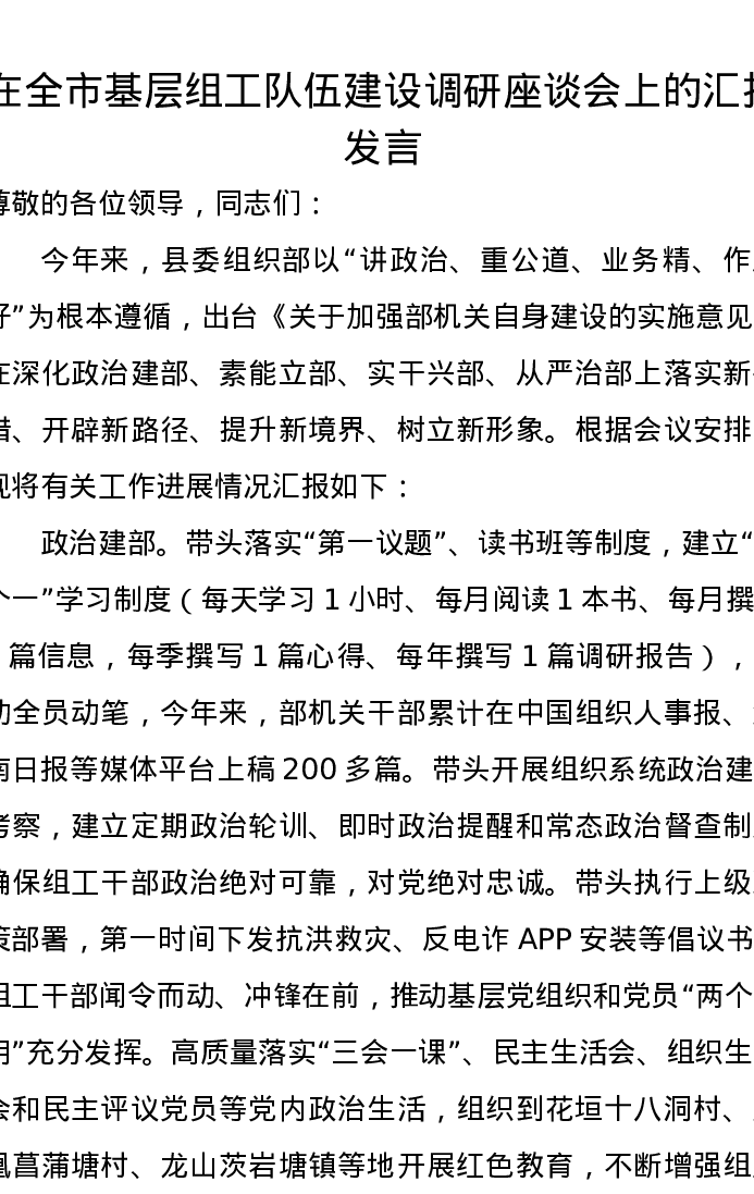 在全市基层组工队伍建设调研座谈会上的汇报发言