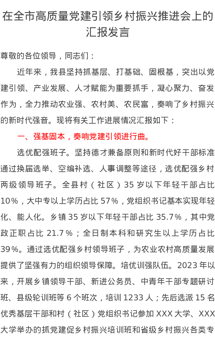 在全市高质量党建引领乡村振兴推进会上的汇报发言