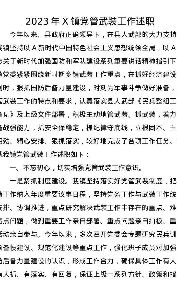 2023年X镇党管武装工作述职
