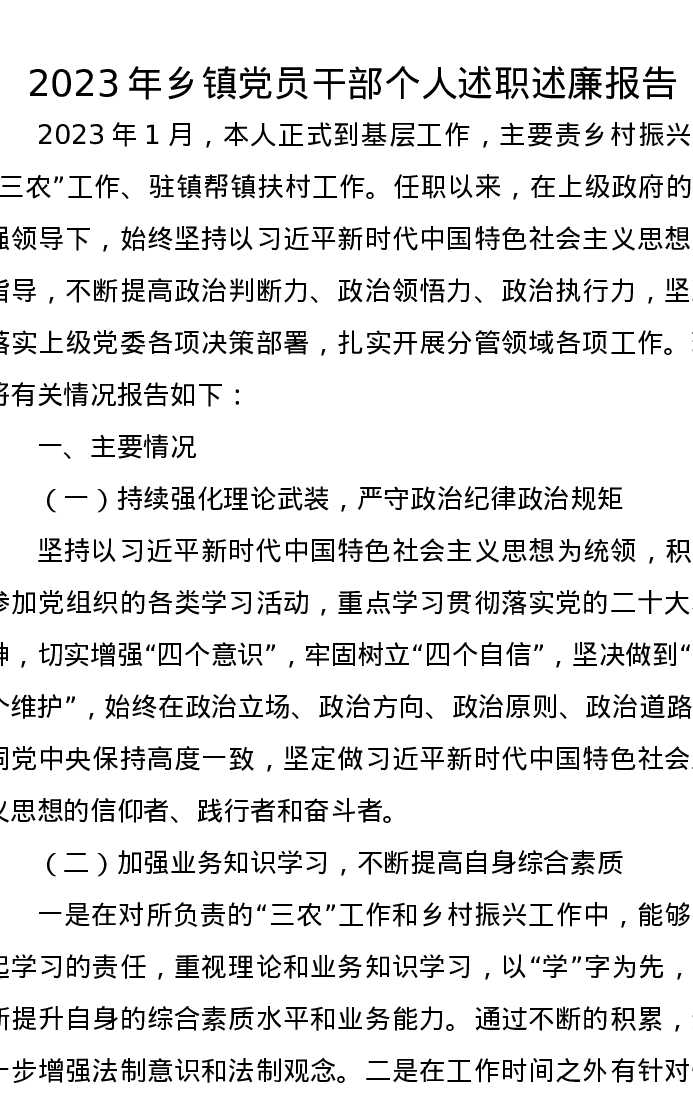 2023年乡镇党员干部个人述职述廉报告