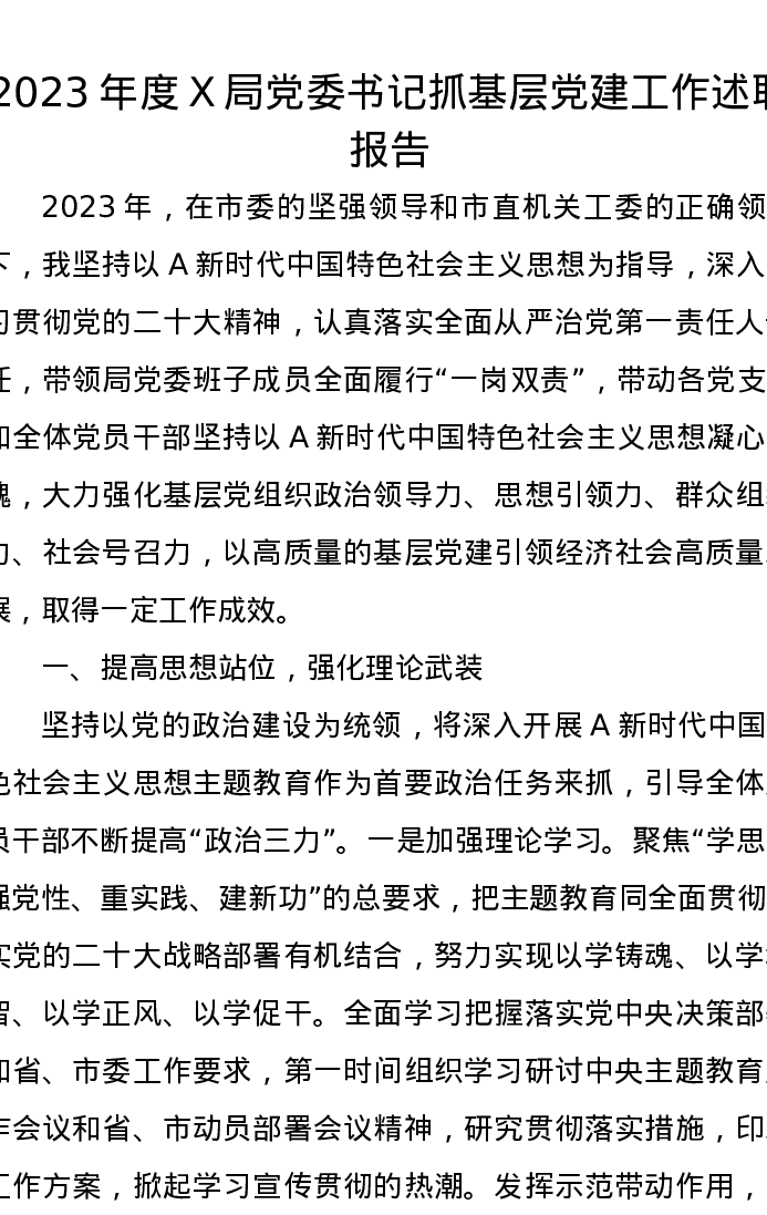 2023年度X局党委书记抓基层党建工作述职报告