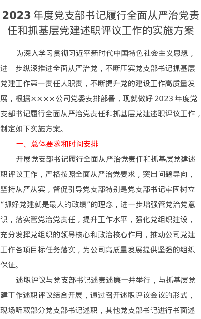 2023年度党支部书记履行全面从严治党责任和抓基层党建述职评议工作的实施方案
