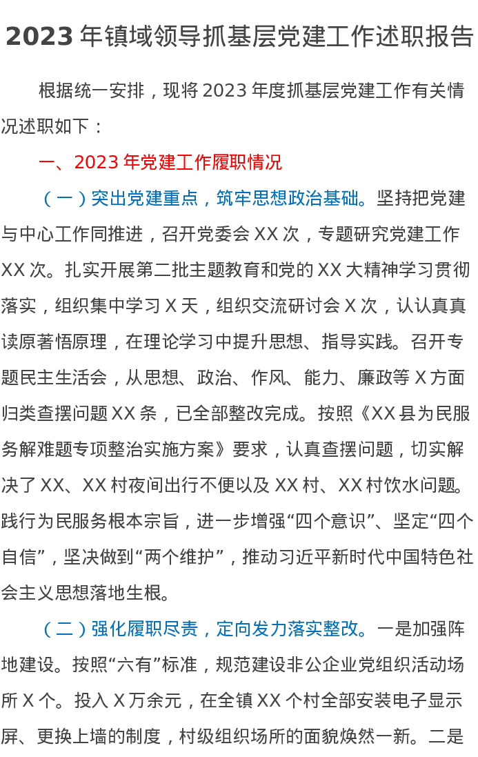 2023年镇域领导抓基层党建工作述职报告