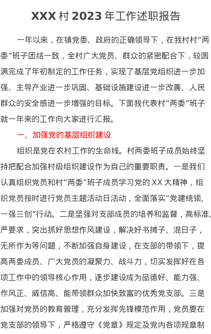 XXX村2023年工作述职报告