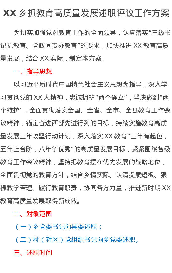 XX乡抓教育高质量发展述职评议工作方案