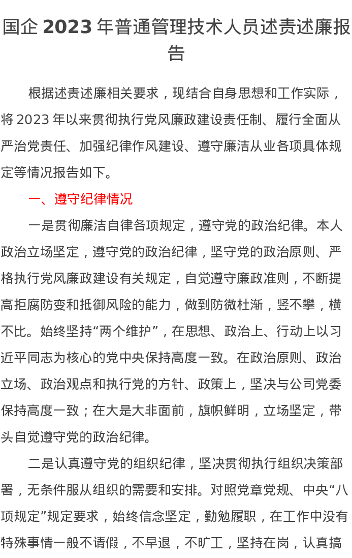 国企2023年普通管理技术人员述责述廉报告2