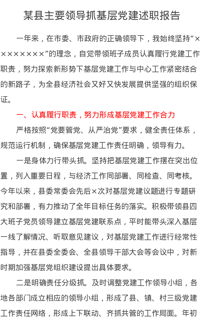 某县主要领导抓基层党建述职报告