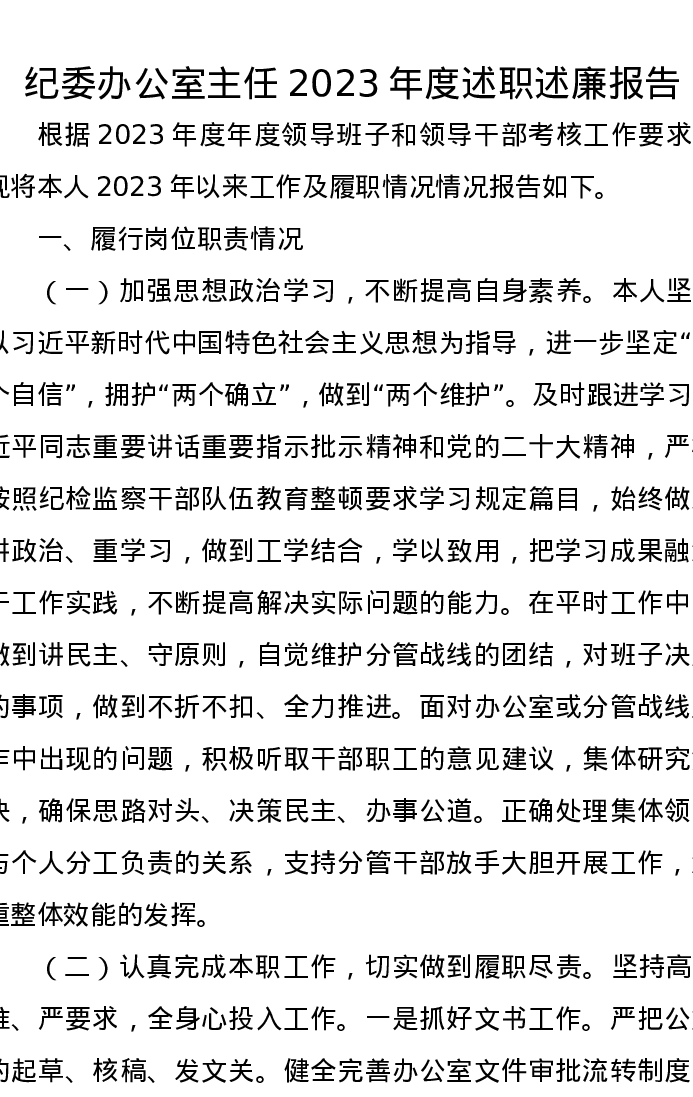 纪委办公室主任2023年度述职述廉报告