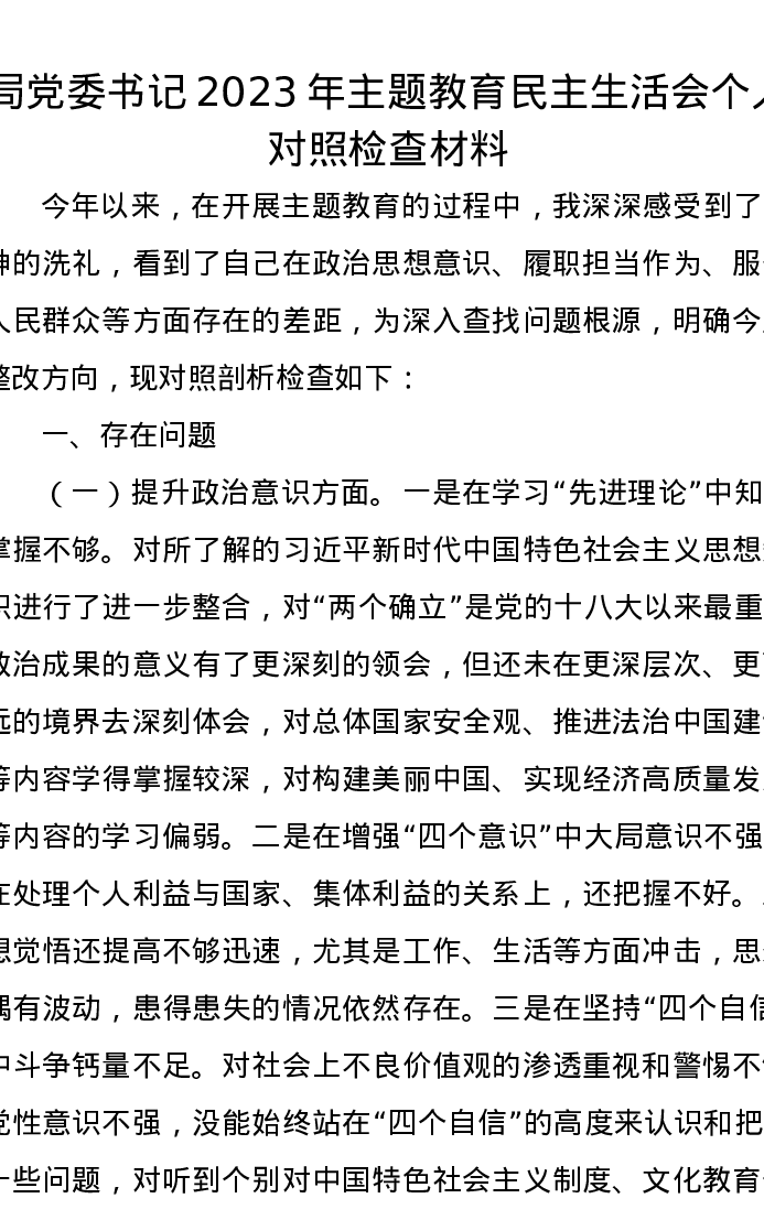 局党委书记2023年主题教育民主生活会个人对照检查材料(特色社会主义思想)