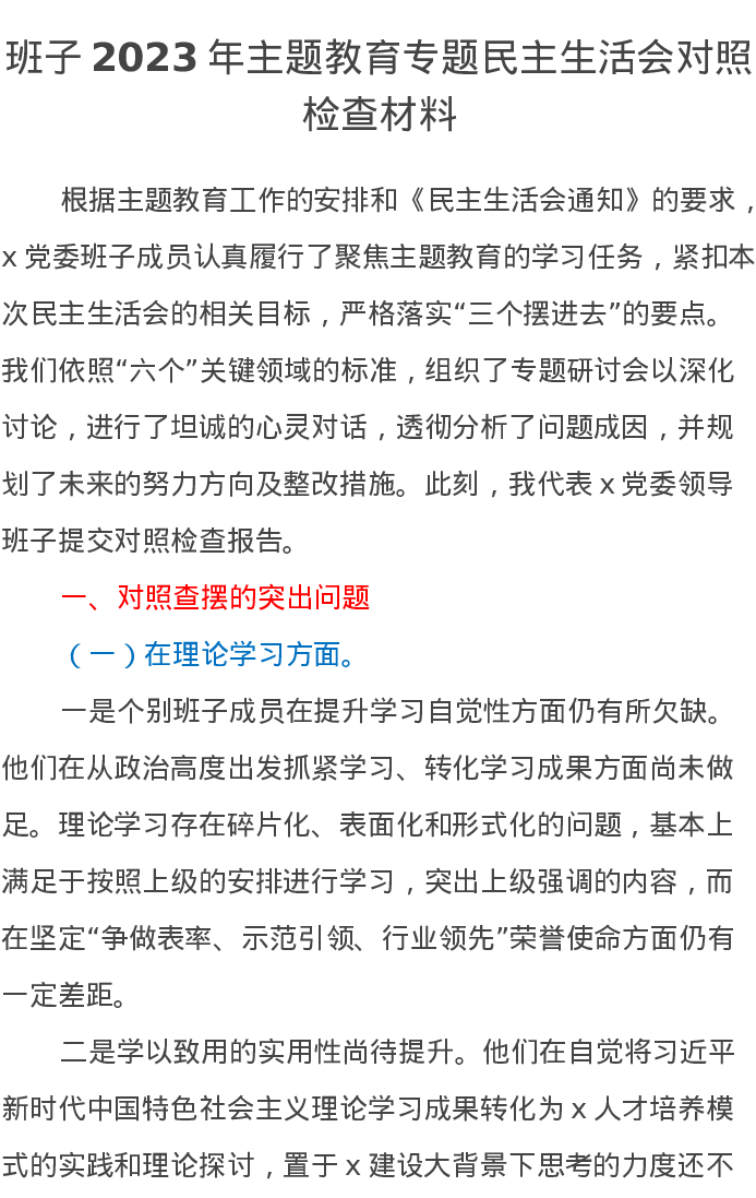 班子2023年主题教育专题民主生活会对照检查材料3(特色社会主义思想)