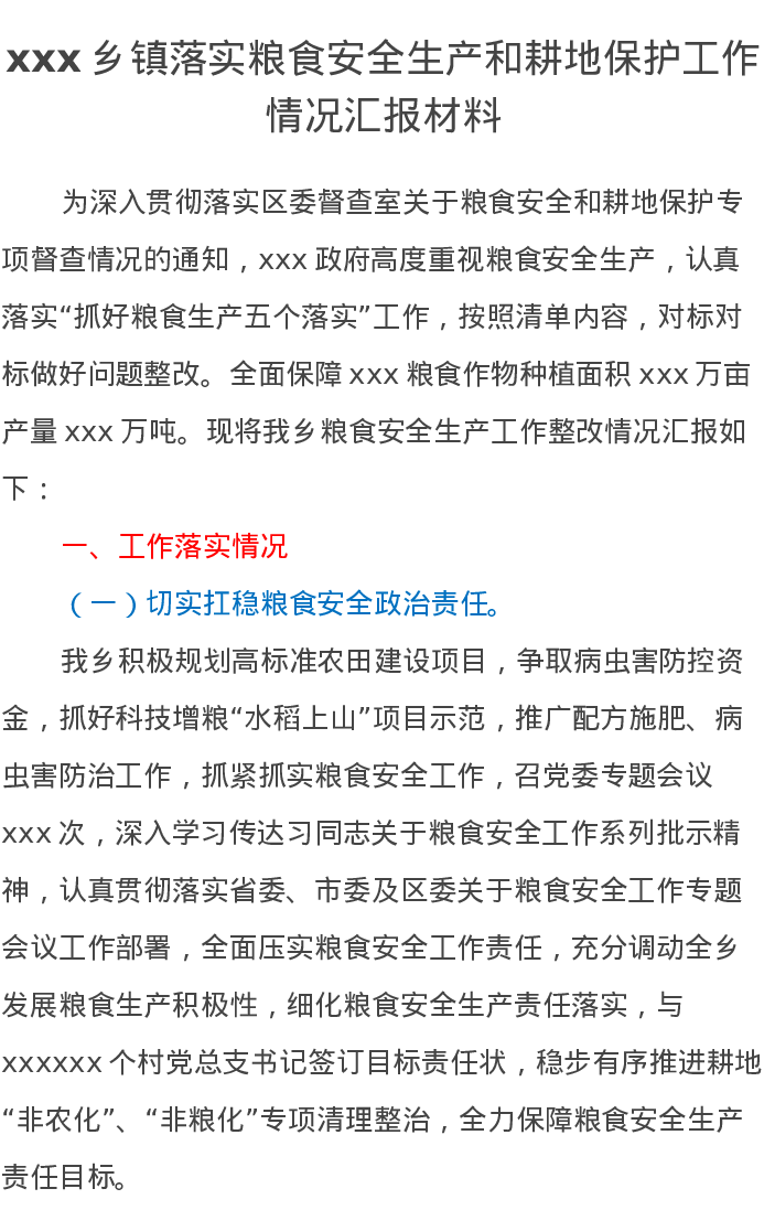 xxx乡镇落实粮食安全生产和耕地保护工作情况汇报材料