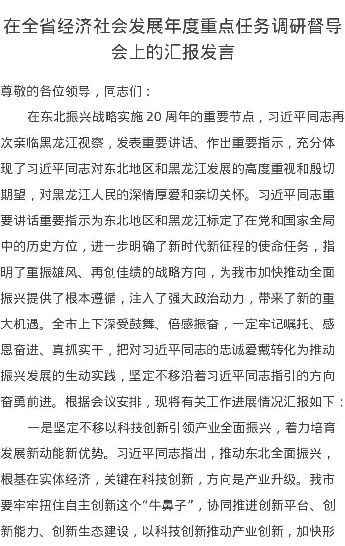 在全省经济社会发展年度重点任务调研督导会上的汇报发言