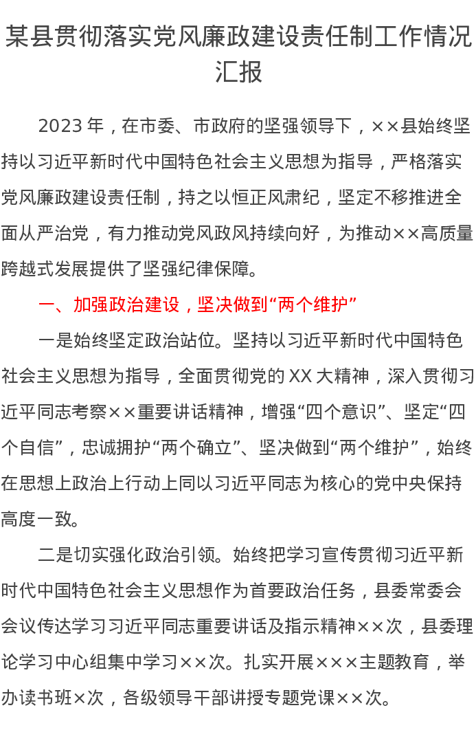 某县贯彻落实党风廉政建设责任制工作情况汇报