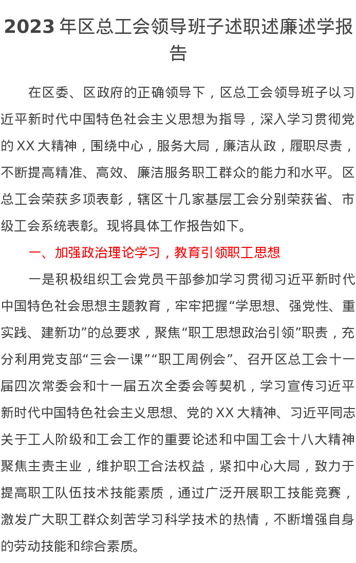 2023年区总工会领导班子述职述廉述学报告