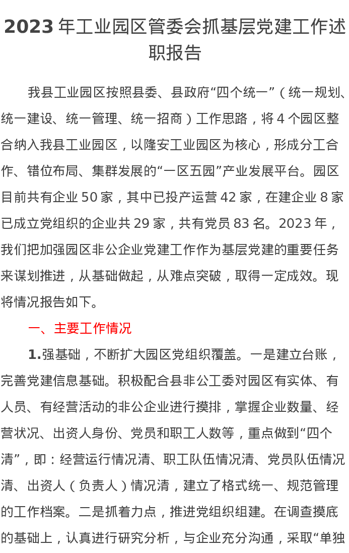 2023年工业园区管委会抓基层党建工作述职报告