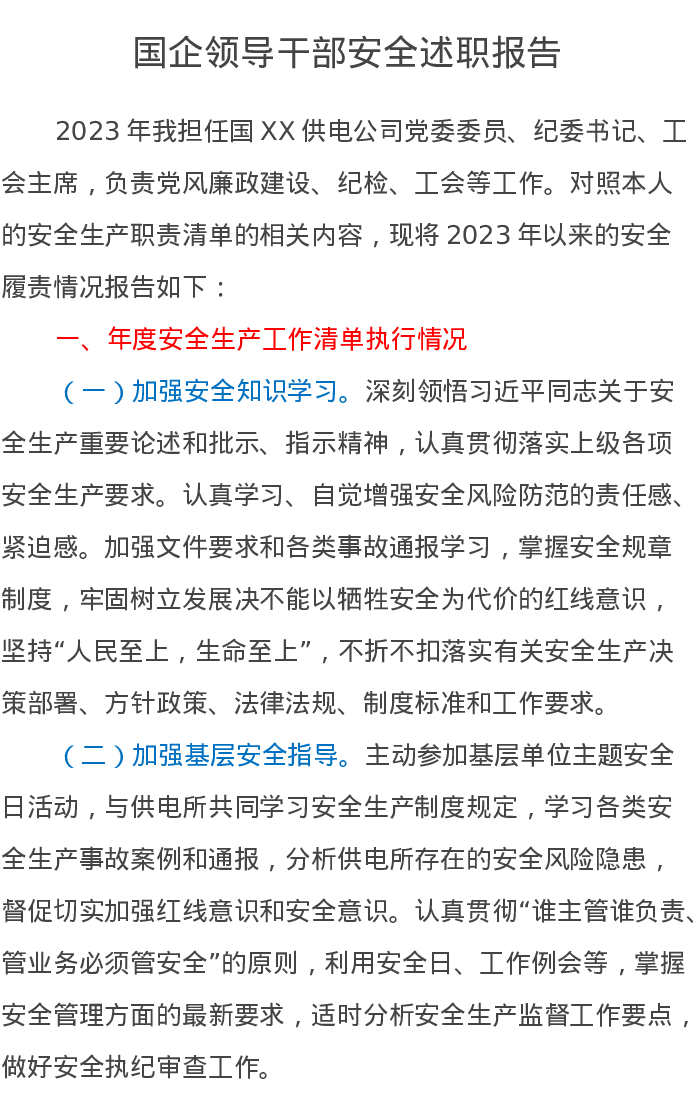 国企领导干部2023年安全述职报告