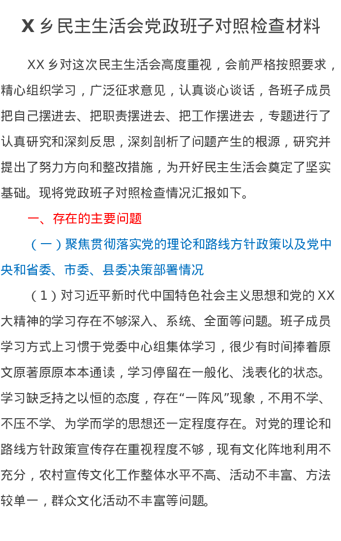 X乡民主生活会党政班子对照检查材料